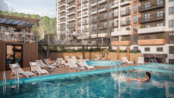 первый в Сочи жилой комплекс класса "комфорт" с круглогодичной аквазоной. На площади 473 кв.м. будут расположены два подогреваемых бассейна для взрослых и детей и сауна.