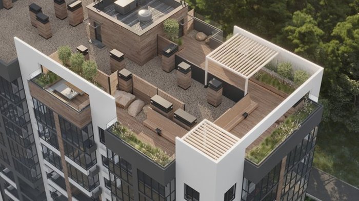 7 видовых террас на крышах — приватные зоны для отдыха с панорамными видами на природу. Здесь можно медитировать, заниматься йогой, загорать или встречаться с друзьями под звёздным небом.