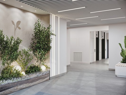 дизайн сочетает минимализм и экологичность. Сдержанные цвета, натуральные материалы, лаконичные формы и мягкий свет создают атмосферу «тихой роскоши». Единственный яркий акцент — живые растения в холлах. Интерьеры дополнены керамогранитом, скрытыми дверями и эргономичной мебелью в урбанистическом стиле.